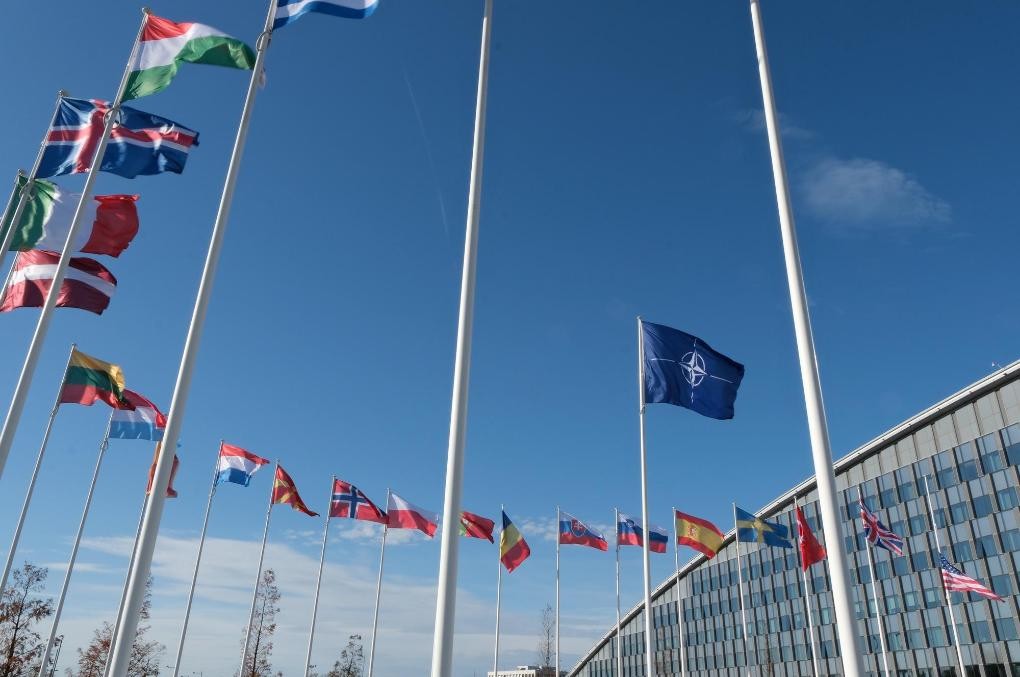 這是2025年11月5日在比利時首都布魯塞爾拍攝的北約總部大樓外的北約及成員國旗幟。新華社圖片
