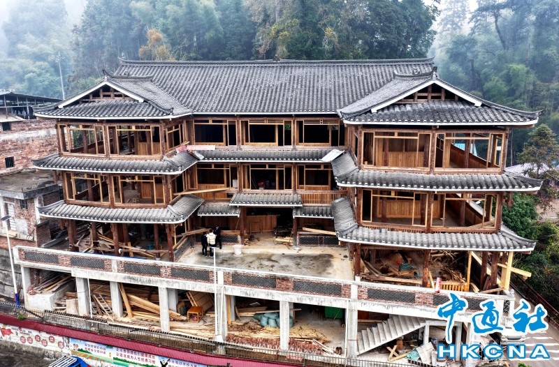 圖為石善章新建的三層雙塔式木樓。 香港中通社圖片