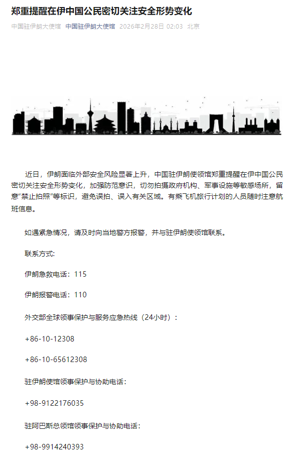 文章稱,近日,伊朗面臨外部安全風險顯著上升,中國駐伊朗使領館鄭重提醒在伊中國公民密切關注安全形勢變化,加強防範意識,切勿拍攝政府機構、軍事設施等敏感場所,留意“禁止拍照”等標識,避免誤拍、誤入有關區域。有乘飛機旅行計劃的人員隨時注意航班信息。