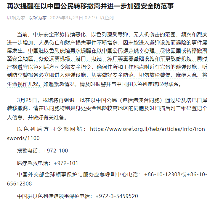 中國駐以色列使館稱,3月25日,將再組織一批在以中國公民(包括港澳台同胞)通過埃及塔巴口岸轉移撤離,請在以同胞特別是身處安全風險較高地區的同胞及時登記個人信息,並做好有關準備。