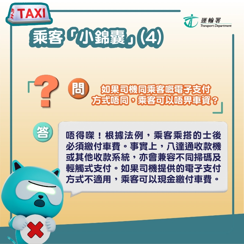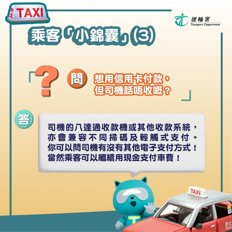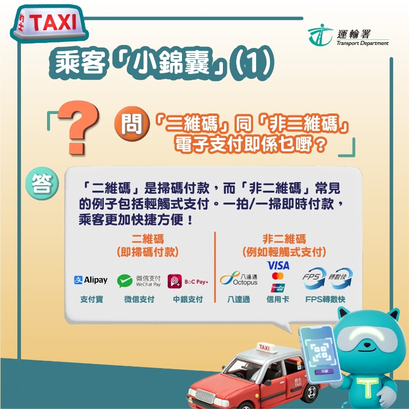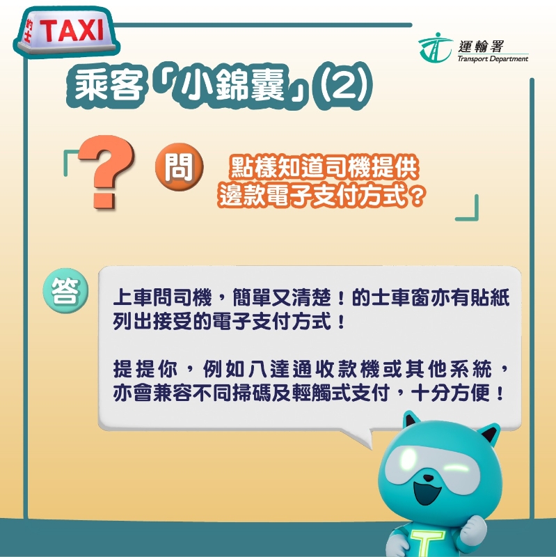 乘客上車前可查詢司機提供的電子支付方式,車窗亦會張貼相關標識。