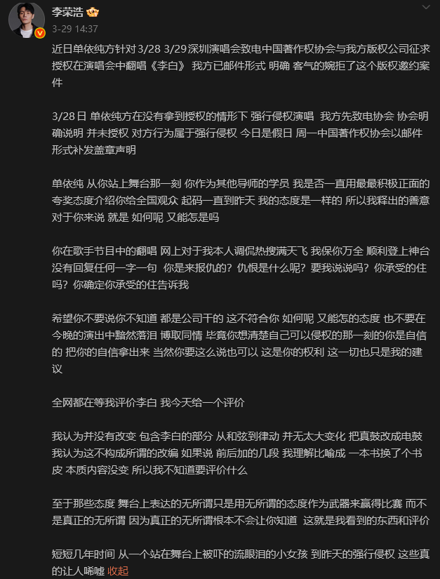 今年3月29日,李榮浩在微博連發多條長文,直指單依純在深圳演唱會“強行侵權”演唱《李白》。他明確表示,單依純團隊曾就3月28日、29日兩場演出向中國著作權協會及李榮浩版權公司申請授權,但“我方已通過郵件明確、客氣地婉拒”。然而,3月28日晚,單依純仍在明知未獲許可的情況下登台演唱該曲。中國著作權協會隨後確認:“並未授權”,定性為“強行侵權”。