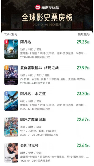 香港新聞網4月10日電(記者 錢林霞)據貓眼專業版數據顯示,截至4月9日,國產動畫電影《哪吒之魔童鬧海2》(簡稱《哪吒2》)全球票房攀升至22.67億美元,正式超越經典影片《泰坦尼克號》的22.64億美元,躋身全球影史票房榜第4位。除了票房這一核心收入來源,《哪吒2》IP已延伸至全產業鏈。《哪吒2》周邊熱銷的背後,不僅是電影熱度與IP價值的延續,更折射出優質內容和成熟衍生品市場相互賦能的良性循環。