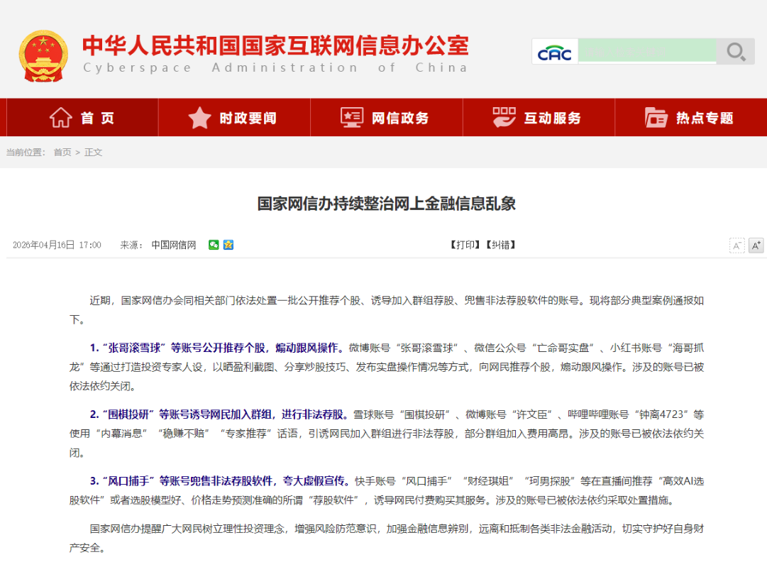 香港中通社4月16日電 近期,中國國家互聯網信息辦公室會同相關部門依法處置一批公開推薦個股、誘導加入群組薦股、兜售非法薦股軟件的賬號,並於16日通報部分典型案例。
